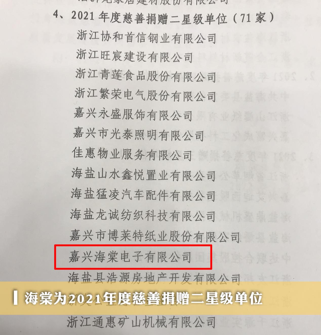 嘉興海棠電子獲得第五屆“海鹽慈善獎(jiǎng)”2021年度慈善捐贈(zèng)二星級(jí)單位,嘉興海棠電子將繼續(xù)保持善舉,貢獻(xiàn)企業(yè)的一份愛(ài)心力量。