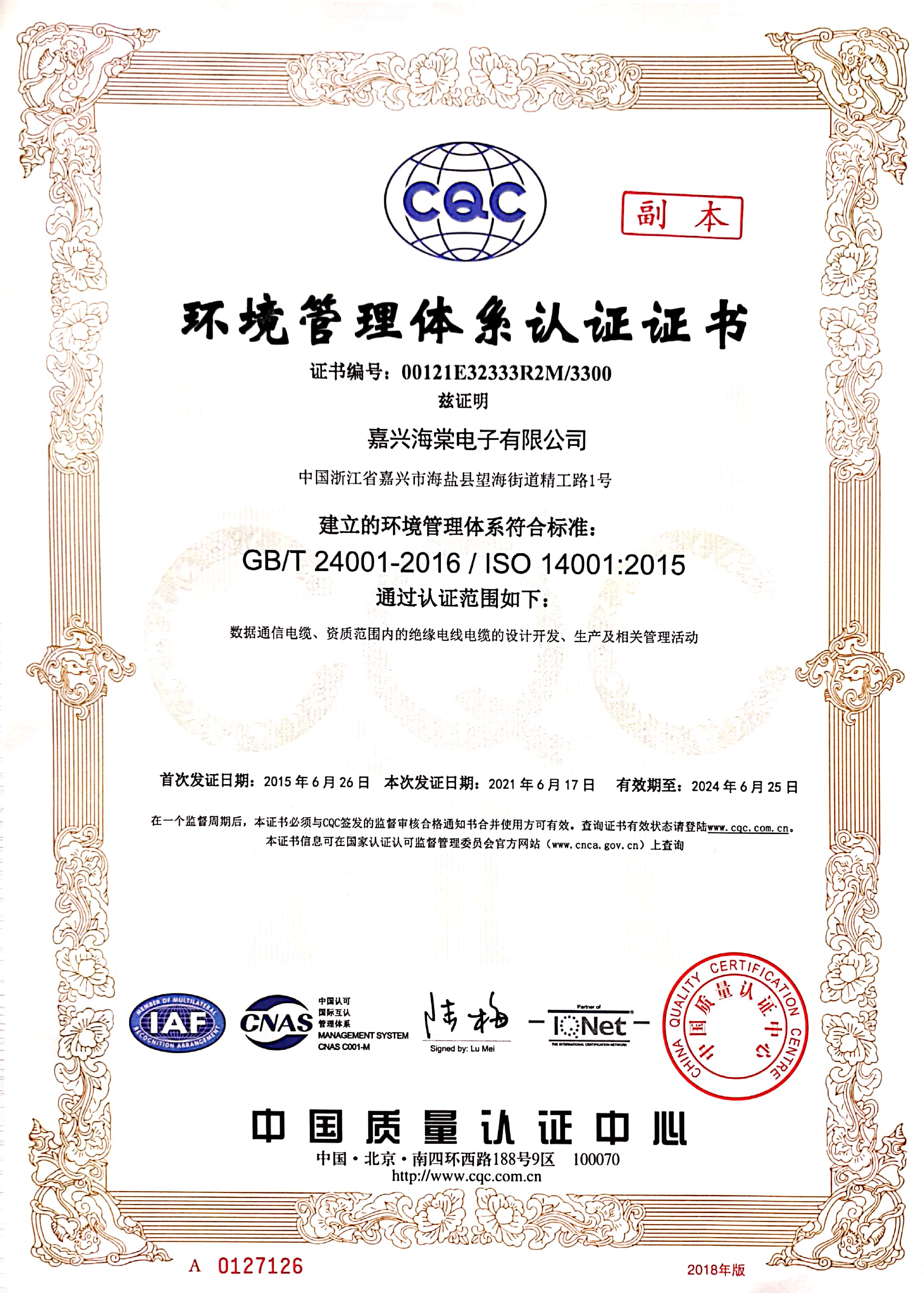 環(huán)境體系證書