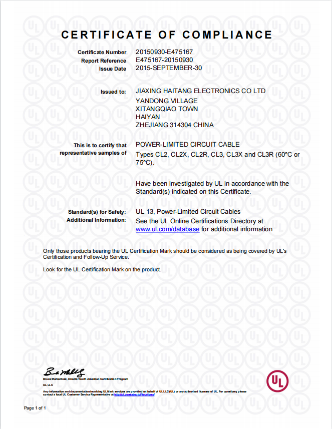 Power-Limited Circuit Cable-E475167UL認證