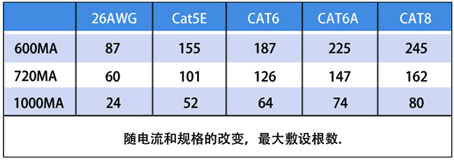 由表可以看出,同一規(guī)格下,電流增大,在安全條件下,最大敷設(shè)根數(shù)減??;電流恒定時,網(wǎng)線類別越高,最大敷設(shè)根數(shù)越大。