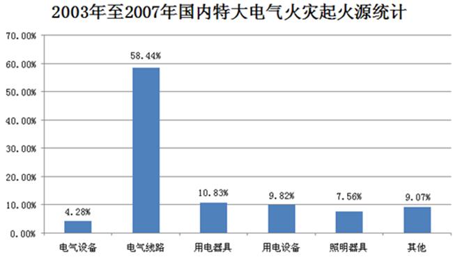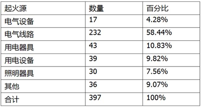 綜上所述,我們可以看出,電氣起火是火災(zāi)的主要原因,而電氣線路是主要起火源,主要都是因?yàn)殡娋€由于老化等原因?qū)е戮€路短路而引起火災(zāi)。