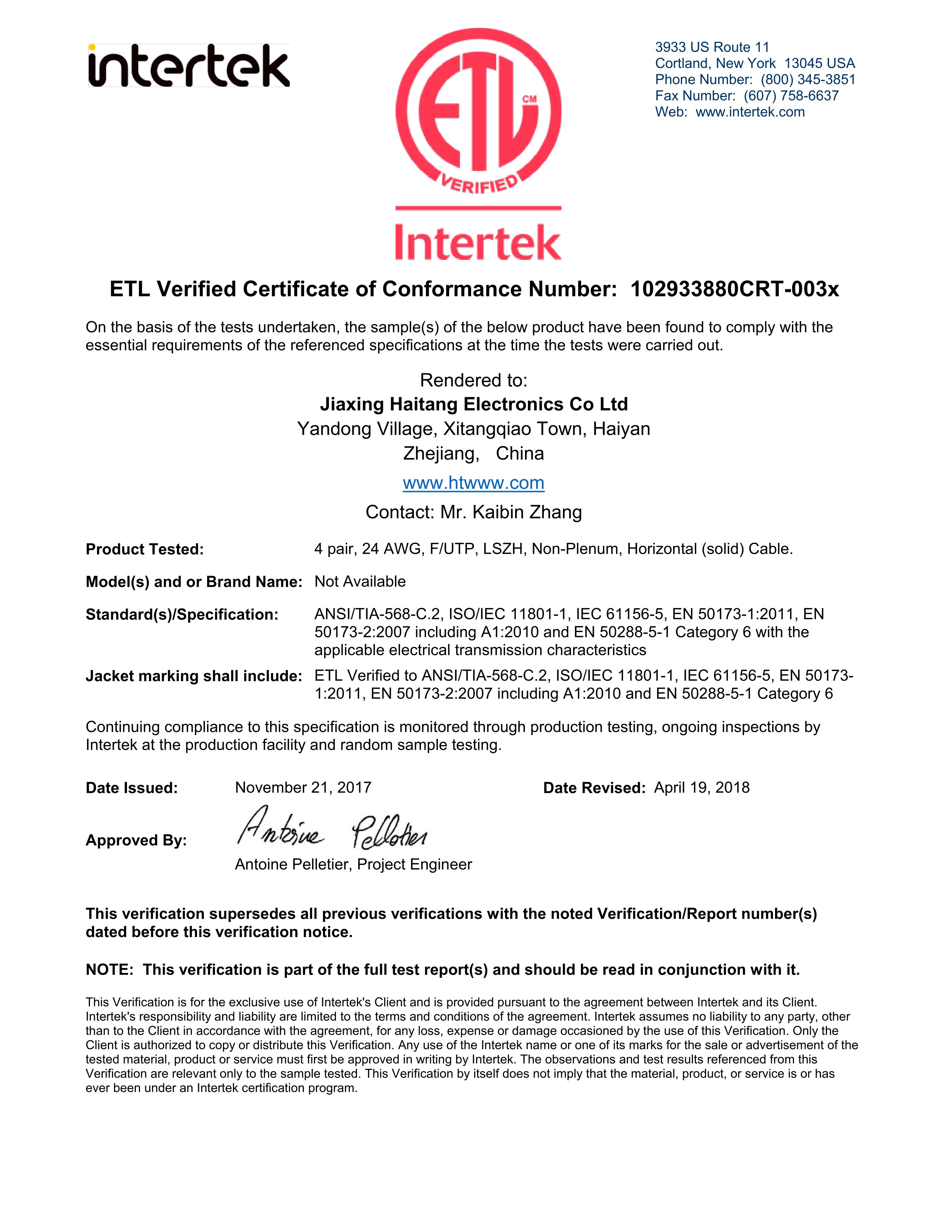 SFTP CAT7 23AWG LSZH ETL性能認(rèn)證