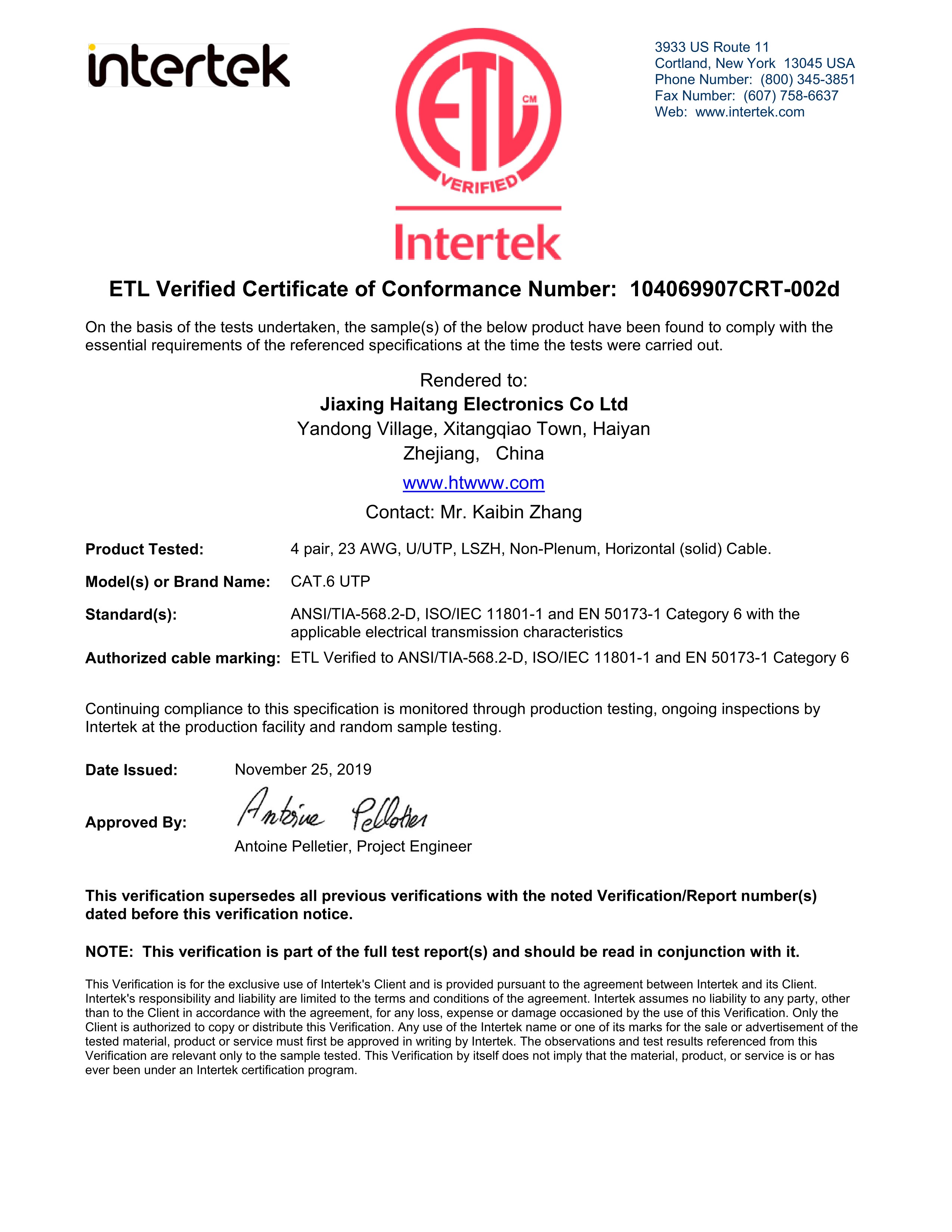 UUTP CAT6 23AWG LSZH ETL性能認(rèn)證