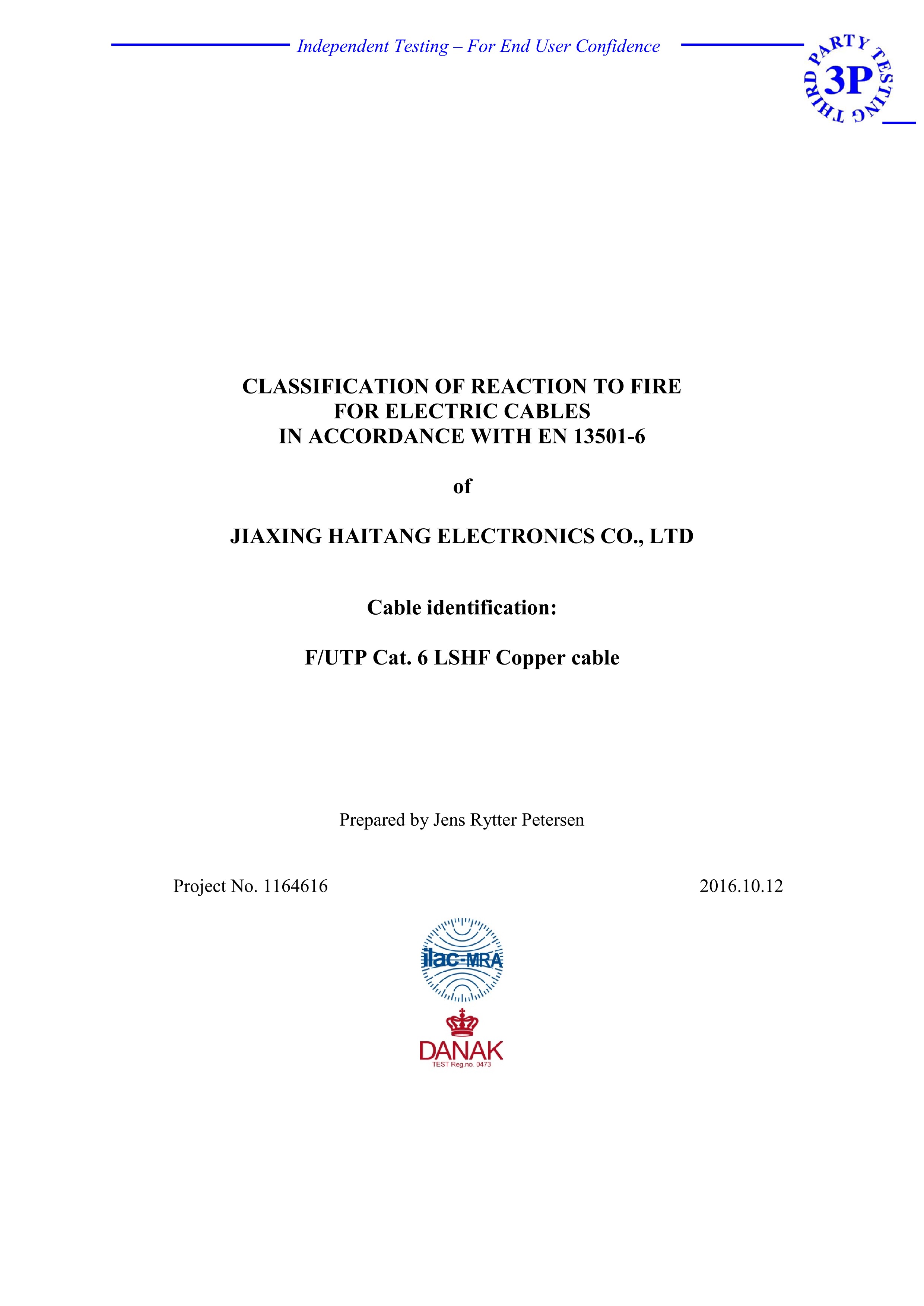 FUTP Cat.6 LSHF Copper cable 3P CPR E級認證